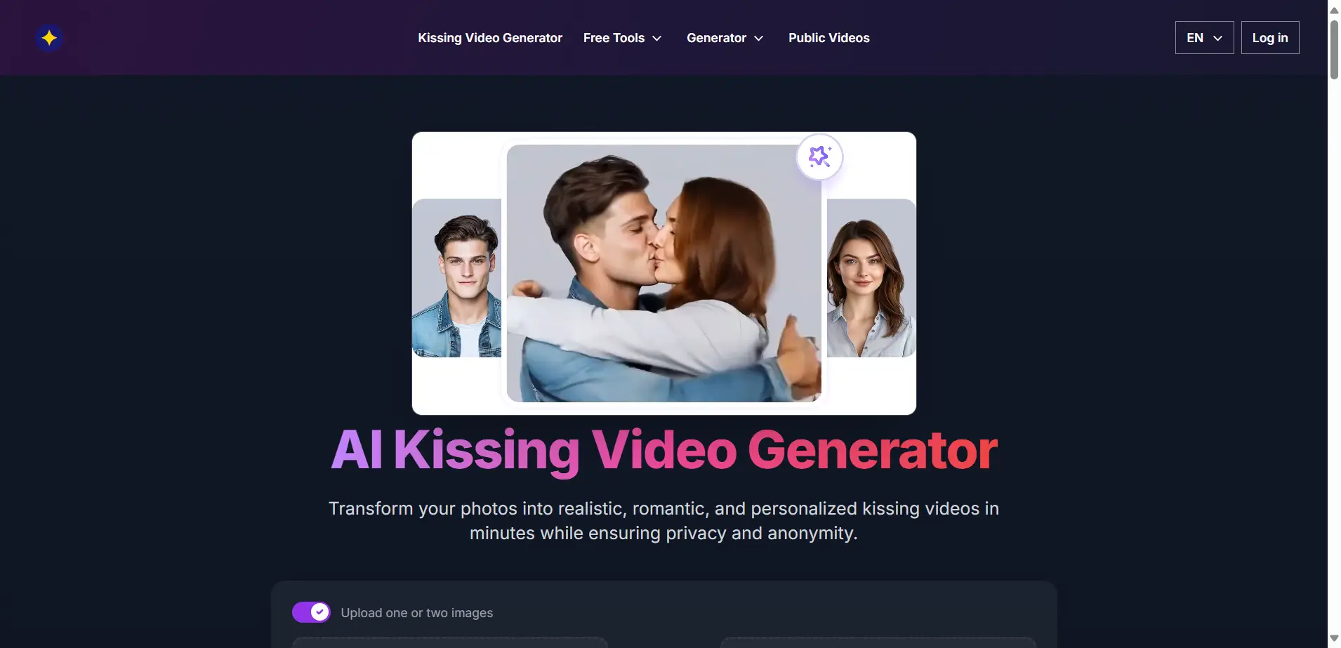 AI Kissing Video Generator lets you transform photos into romantic, realistic kissing videos in just a few minutes. Designed for privacy, creativity, and fun, this tool is perfect for couples, creators, and social media users.