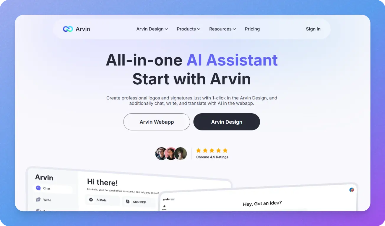 Arvin is a multi-purpose AI assistant that helps you design logos, write content, chat with AI models, and translate instantly—all from one browser extension or web app.