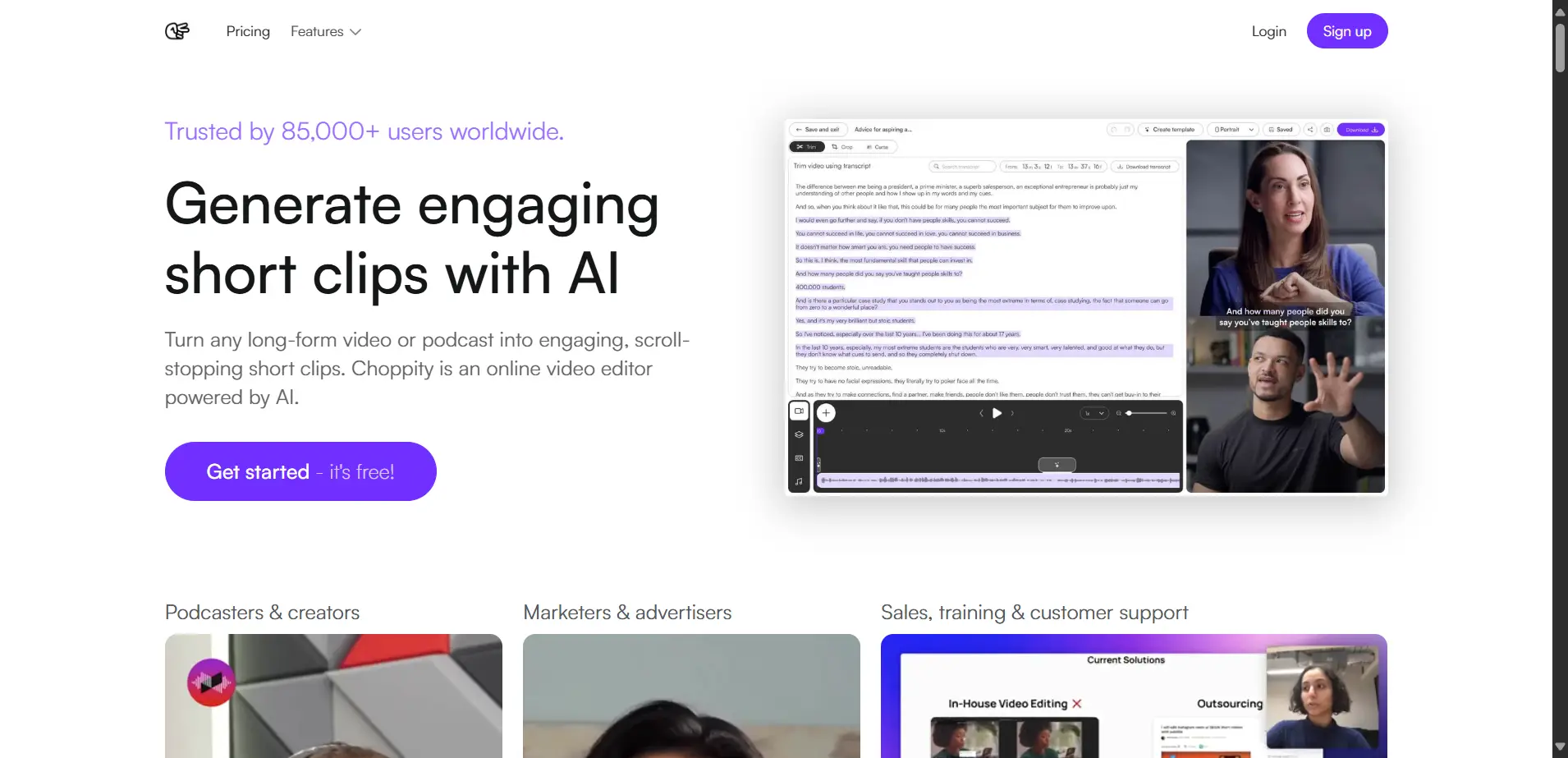Choppity is an AI-powered online video editor that transforms long videos and podcasts into scroll-stopping, shareable short clips. It automates the editing process while letting you keep full creative control, making it ideal for content creators, agencies, and businesses.