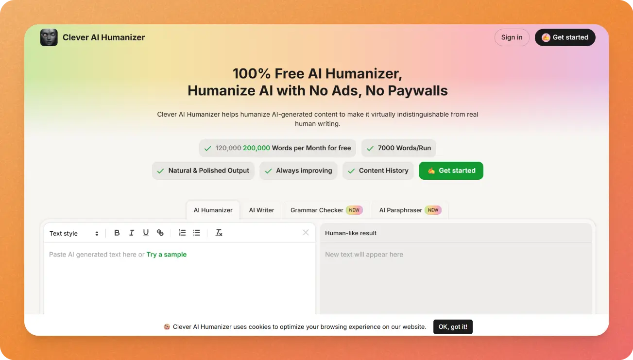 Clever Humanizer transforms AI-generated text into natural, polished writing that reads more like human content. Paste your text, click humanize, and get refined output ready for publishing within moments.