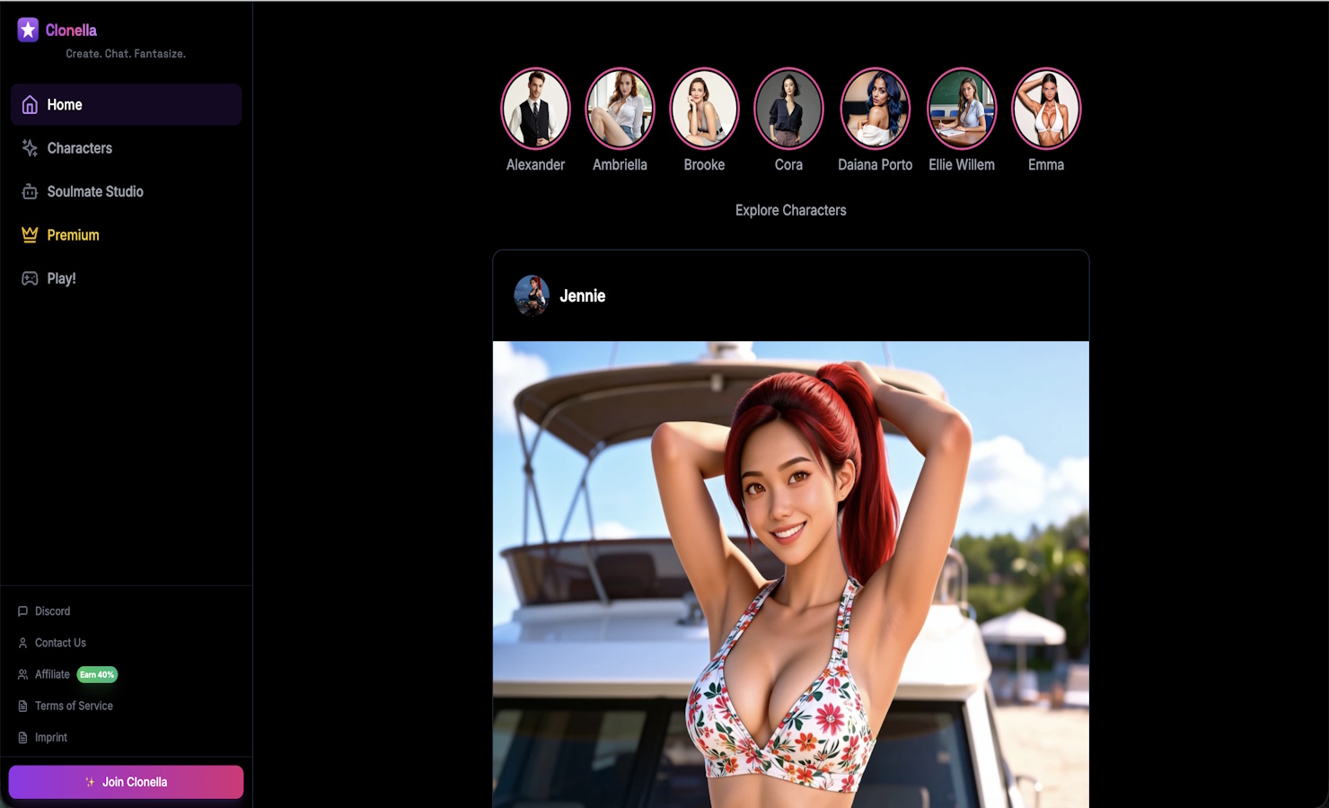 Clonella is an AI companion platform where users can create custom AI girlfriends, boyfriends and characters for immersive conversations and roleplay. Build your own personality, appearance and story, then chat without restrictions. Supports image and video interactions, character creation and open-ended AI conversations.