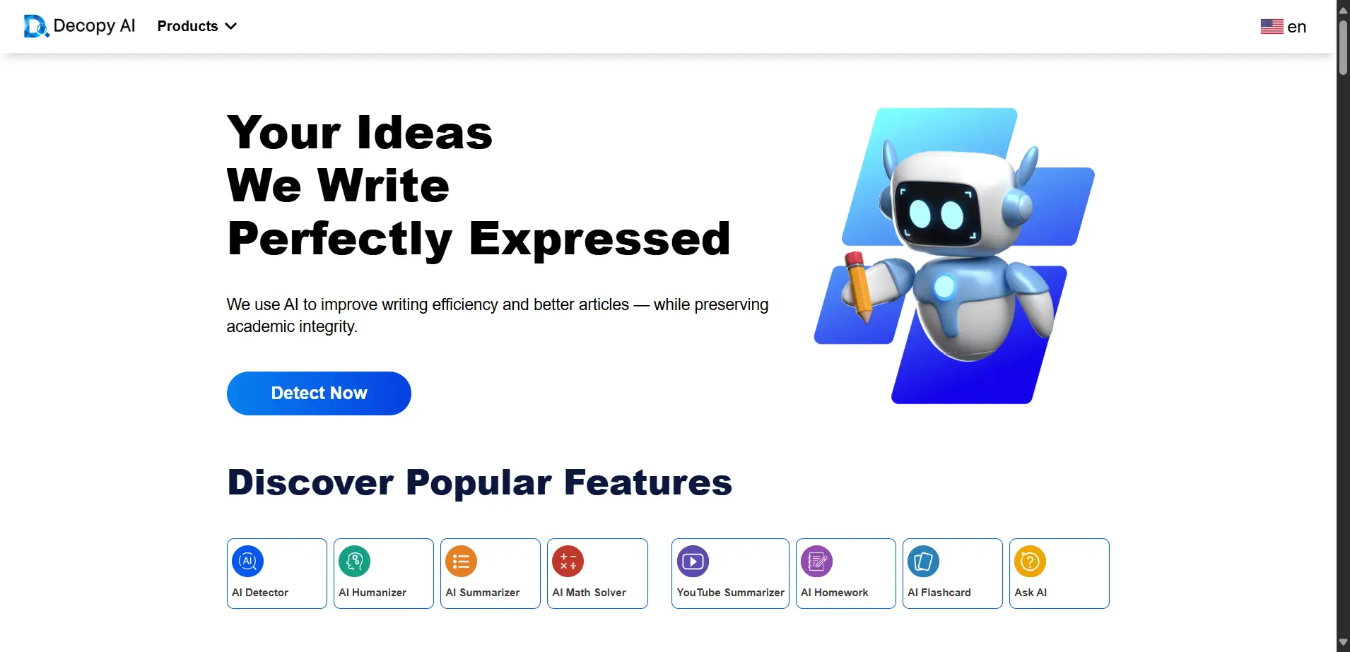 Decopy AI is an all-in-one writing assistant that helps you create polished, original, and academic-friendly content. Whether you need to detect AI-generated text, humanize robotic writing, summarize lengthy documents, or solve math problems, Decopy AI is built to support students, educators, content creators, and professionals. It helps you write with confidence while maintaining originality and academic integrity.