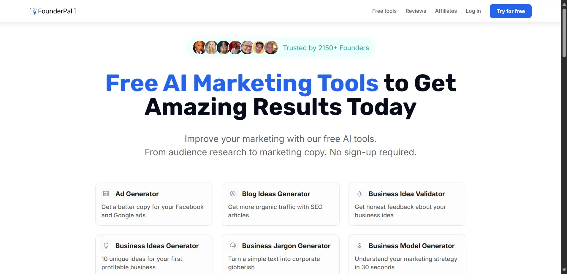 FounderPal is your all-in-one solution to supercharge your marketing strategy using AI. From finding your audience to crafting perfect ad copy, these tools make marketing faster, smarter, and effortless—no sign-up or tech skills required.