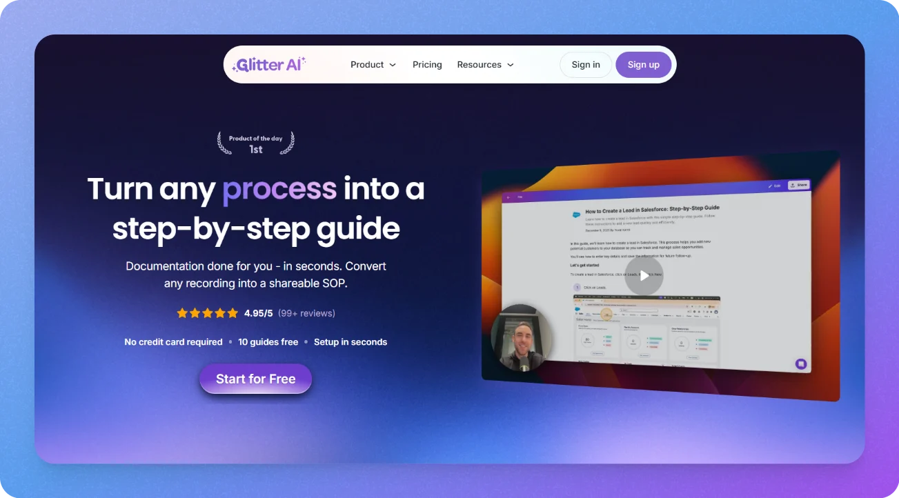 Glitter AI transforms recordings directly into structured documentation with screenshots and written steps. Instead of manually creating guides, teams can simply record a process and instantly generate professional SOPs.