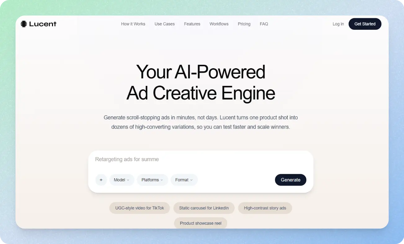 Lucent is an AI-powered ad creative platform built for performance marketers who need speed, scale, and results. It transforms a single product idea into dozens of scroll-stopping, on-brand ad variations—ready to test across platforms in minutes, not days.