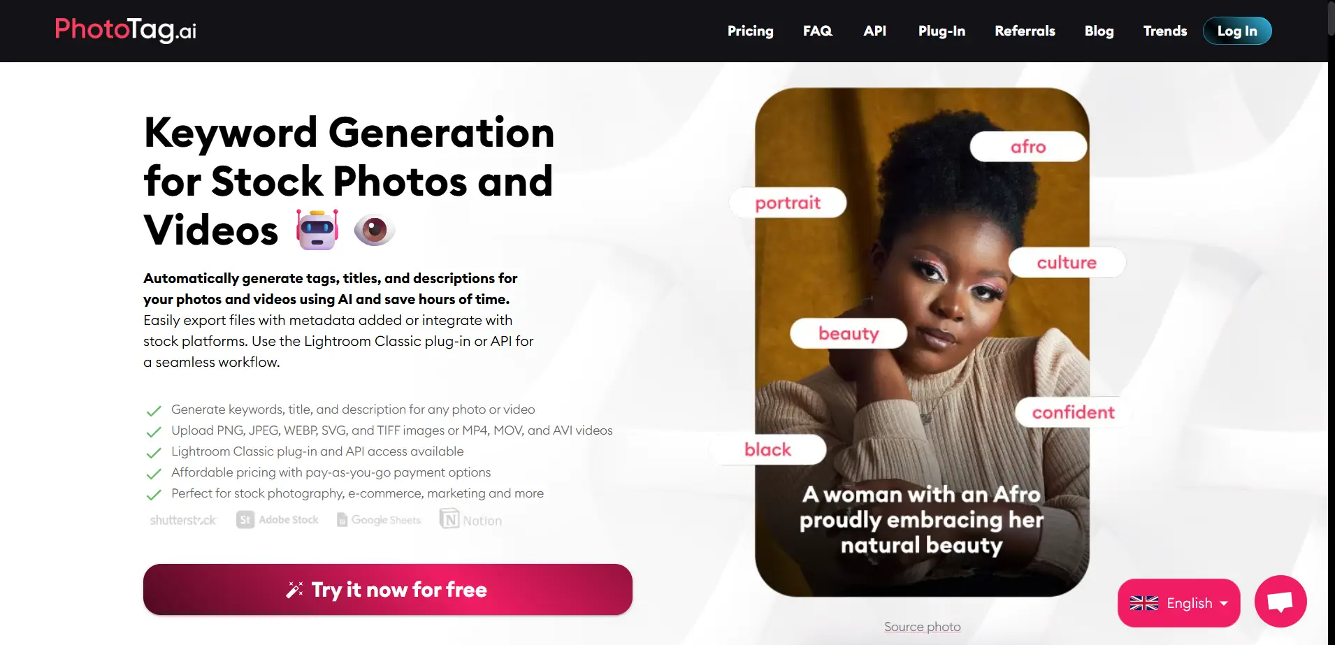 Save hours with Phototag AI-powered keyword, title, and description generator. Instantly tag photos and videos with precise, SEO-friendly metadata. Ideal for stock photographers, e-commerce stores, and content creators.