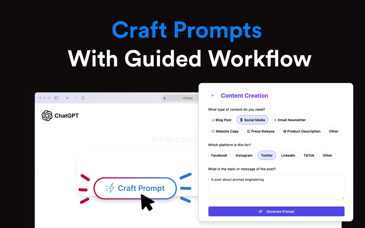 Teleprompt is a Chrome extension that helps you write powerful prompts without leaving your favorite AI chat apps. With one click, it improves your input, boosts response quality, and saves you valuable time.