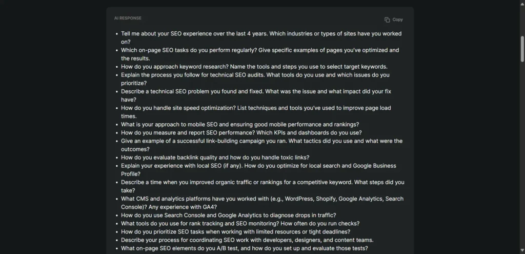 Recruiters, small business owners, and hiring managers who need a fast, no-frills tool to create relevant interview questions for any job.