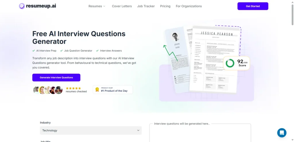 ResumeUp AI’s Free Interview Questions Generator is a powerful AI tool designed to transform your resume and job description into highly tailored interview questions. Users upload their resume and input the job details, then select question types like behavioral or technical along with the interview duration to generate a curated question set. Powered by the latest GPT technology, it provides categorized and role-specific questions with sample answers to boost confidence and readiness. This makes interview preparation more precise, helping job seekers, recruiters, and career coaches save time while focusing on what matters most for the targeted role.