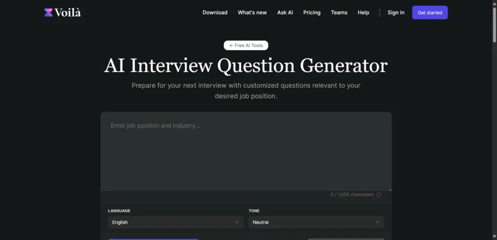 Voilà AI’s is a free AI interview questions generator tool designed to make interview preparation more focused and efficient. By simply entering a job title and selecting an industry, users receive tailored interview questions in seconds. The platform supports multiple languages and offers tone customization, allowing users to prepare for interviews that match company culture and communication style. It covers behavioral, technical, and situational questions — helping candidates anticipate what employers may ask. Voilà AI works across websites and productivity tools, making it an accessible, time-saving solution for effective and confidence-building interview practice.
