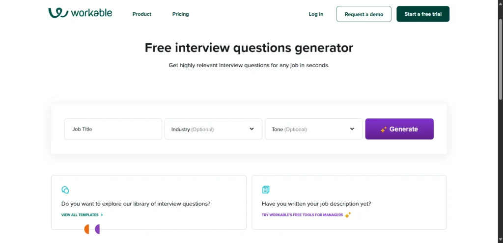 Workable’s AI-driven tool designed for recruiters and hiring managers to generate interview questions tailored to any job role. By entering the position title and optionally selecting the industry and tone, users receive a diverse set of questions instantly. The tool generates questions across four key formats— common interview questions, portfolio review, industry trends and insights, and closing questions—covering a wide range of skills, behaviors, and job-specific competencies. Its straightforward interface requires no sign-up, providing an efficient and accessible way to prepare interview materials for diverse hiring needs.