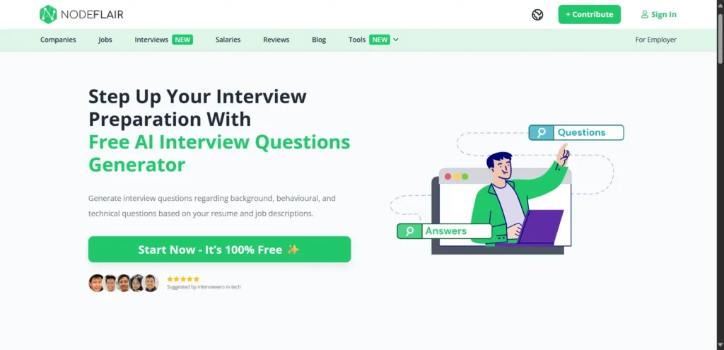 NodeFlair’s free AI Interview Questions Generator is a powerful tool that helps job seekers prepare efficiently by generating personalized interview questions based on their resume and job description. The tool aligns your experience with the target role and creates questions spanning background, behavioral, and technical categories. For each question, it explains its importance, offers a structured framework for answering, and provides sample answers to boost confidence. This comprehensive preparation solution saves time and stress by focusing on the most relevant questions you’re likely to face in your next interview, making it ideal for thorough and targeted interview readiness.