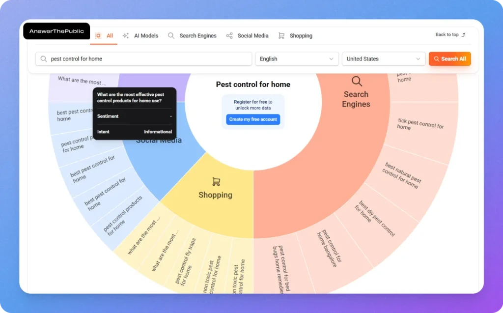Type a keyword like “pest control” and watch AnswerThePublic explode into colorful wheels of real questions people ask. Keywords/Ideas like “pest control tips for home” “pest control for bed bugs home remedies” will pop up into the screen. It shows actual searches pulled live from Google autocomplete and more sources. Content teams can grab these for blog topics that hit audience pain points perfectly. You can export them to CSV and also compare trends over time. Marketers swear by it for filling calendars with stuff people actually Google. Simple, visual, stupidly useful for anyone tired of brainstorming, it is very reliable tools that is widely used as one of the best free digital marketing tools worldwide.